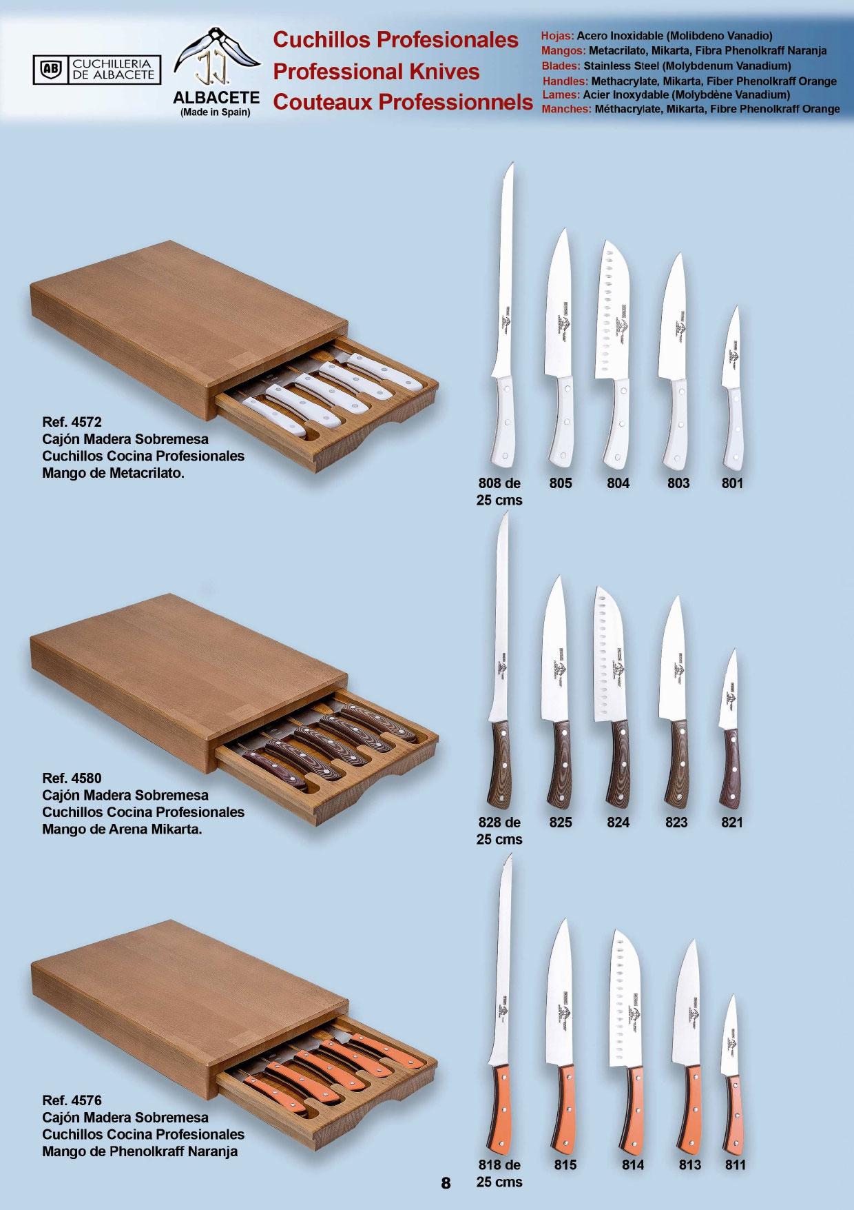 Cajones con cuchillos profesionales con hoja de acero MOVA y mangos de metacrilato, mikarta o fibra.