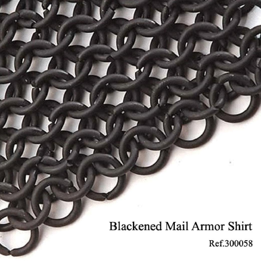 Esta camisa para la armadura está hecha de cota de malla y ha sido ennegrecida para resistir la humedad. Con reminiscencias del Príncipe Negro, quien a propósito dejó su marca en un tono negruzco, y fabricada siguiendo el patrón "internacional".