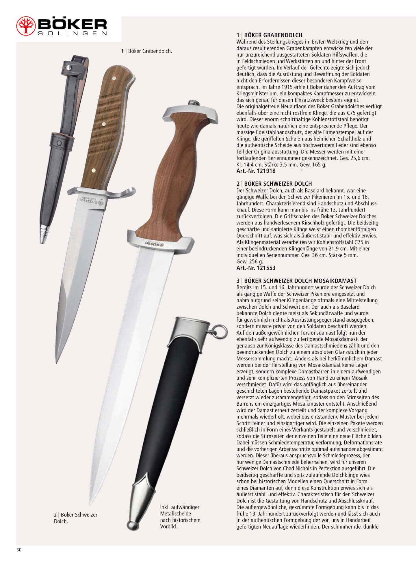 1. Daga trinchera Grabendolch Réplica de la daga trinchera Boker fabricada en 1915 para la II Guerra Mundial. Hoja de acero al carbono C75, con una gran retención de bordes. Guardamanos macizo de acero inox. Antiguo sello de la empresa en la hoja, cachas estriadas de madera. Funda auténtica de cuero de alta calidad.