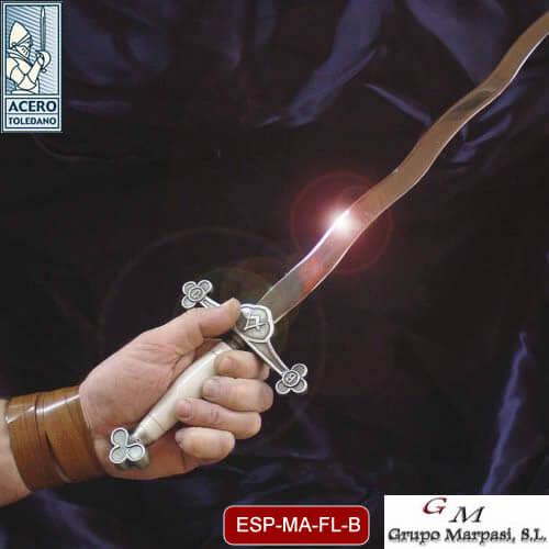 Espada masonica flamigeraAltura: 75 cm / 29.5 pulgadasLongitud: 12 cm / 4.7 pulgadasPeso: 0.7 kg / 1.5 librasESP-MA-FL-B - BronceESP-MA-FL-P - Plata