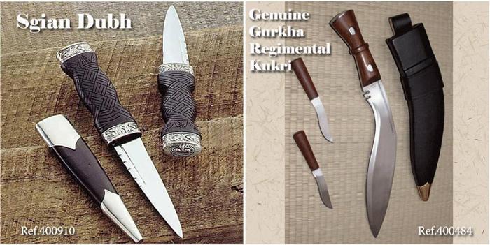 Forjado a mano en acero al carbono. Utilizado por los famosos gurkhas nepaleses en el asedio de Delhi en 1857, en las trincheras de la Primera Guerra Mundial de Francia, a través de la selva de Nueva Guinea, en la Segunda Guerra Mundial, y con distinción en las Islas Malvinas. La hoja tiene un espesor de 1/4" con surcos profundos y la muesca religiosa tradicional. Mango tradicional, de madera nativa. Cantonera de metal. Auténtico diseño militar de los Regimientos Gurkha en la India. El kukri viene con cuchillos accesorios. Incluye la vaina oficial.