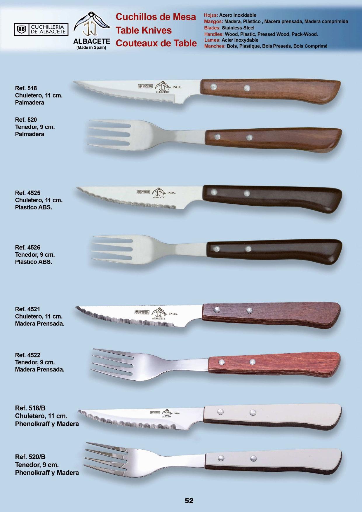 Cuchillos y tenedores de mesaHojas: Acero inoxidableMangos: Madera, Plastico, Madera prensada, Madera comprimida.