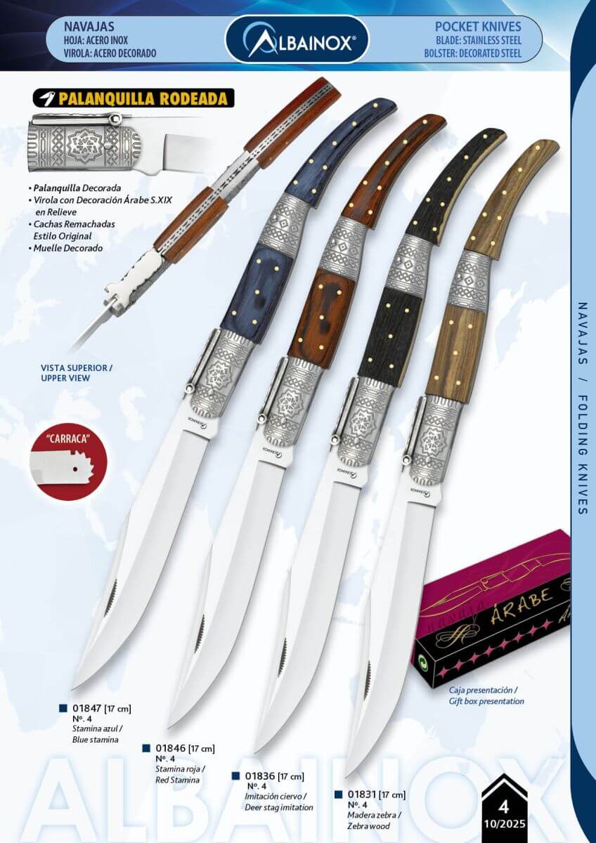 La Navaja Árabe Decorada nº 4 con mango de madera zebra de Albainox combina elegancia natural con el diseño tradicional de inspiración andaluza del siglo XIX. Su hoja de acero inoxidable 3Cr13Mov con acabado espejo, junto al sistema de carraca, virola en relieve y detalles decorativos en la palanquilla y muelle, la convierten en una pieza ideal para coleccionistas. Viene presentada en caja a color, sin funda.