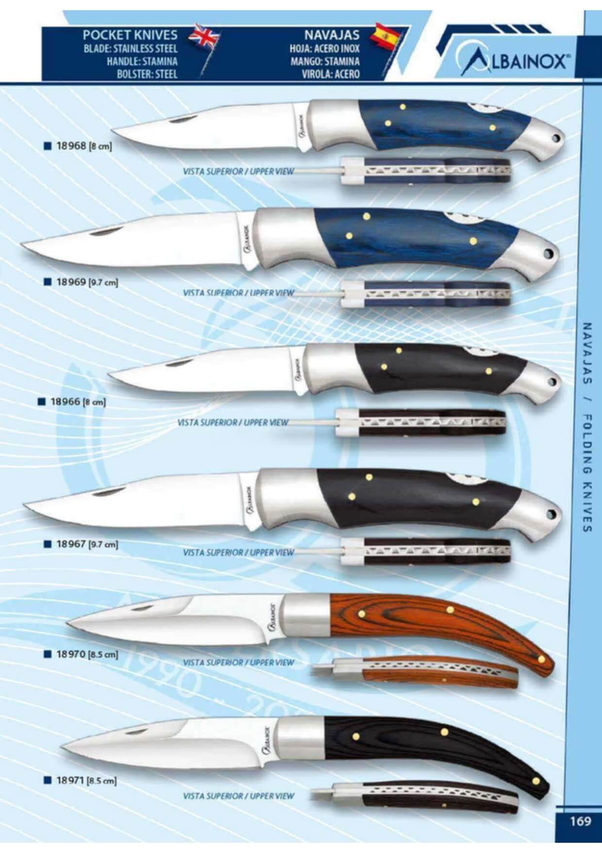 Navaja de bolsillo con mango de estamina azul y virola de acero inoxidable. Su hoja de acero inoxidable 3CR13MOV mide 8 cm y se bloquea mediante botón trasero.