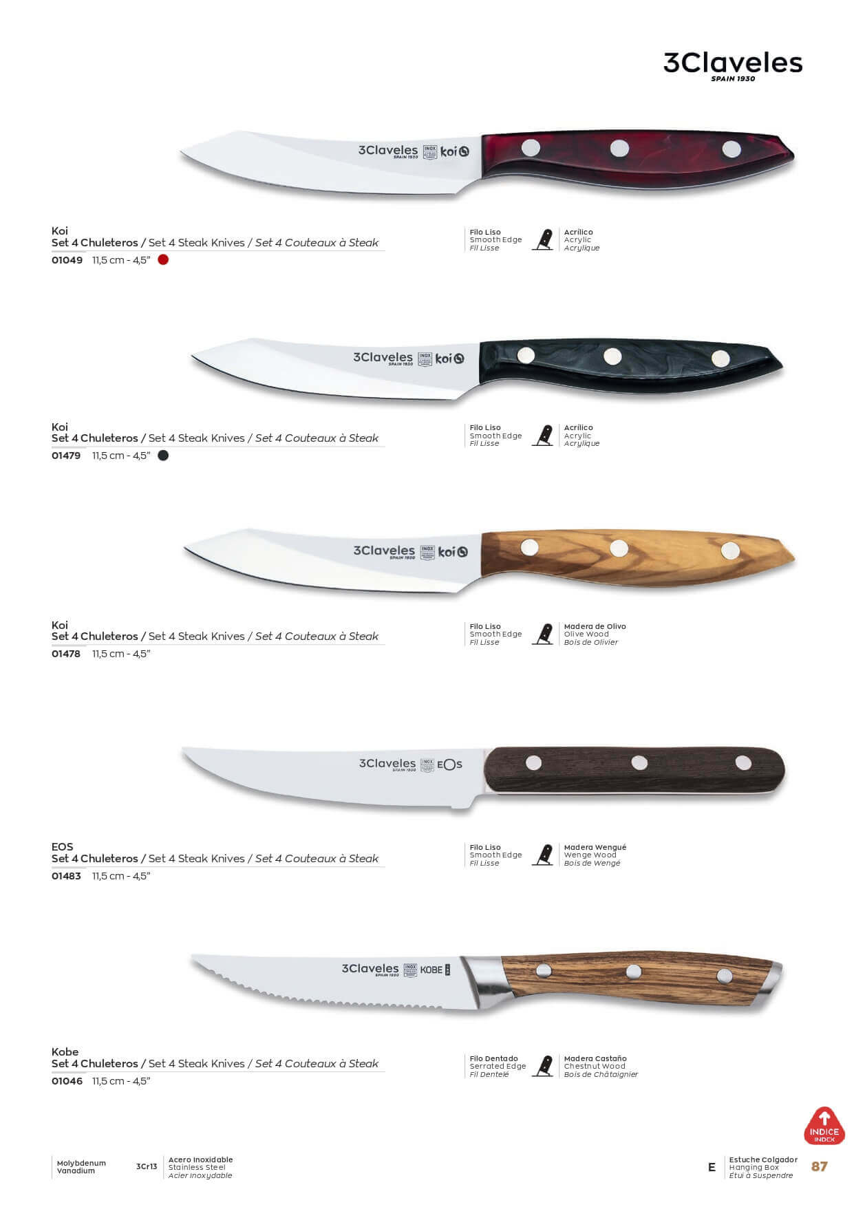 Cuchillos chuletero con hojas de acero inoxidable 3Cr13 con filo dentado liso o mixto.