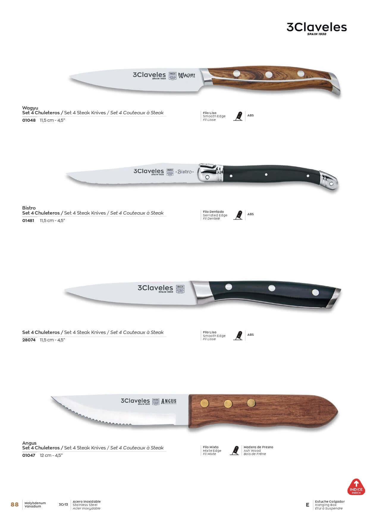 Cuchillos chuletero con hojas de acero inoxidable 3Cr13 con filo dentado liso o mixto.