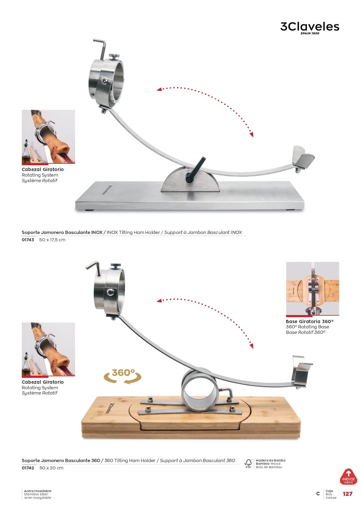 Soporte para jamonero basculante de acero inox con cabezal giratorio