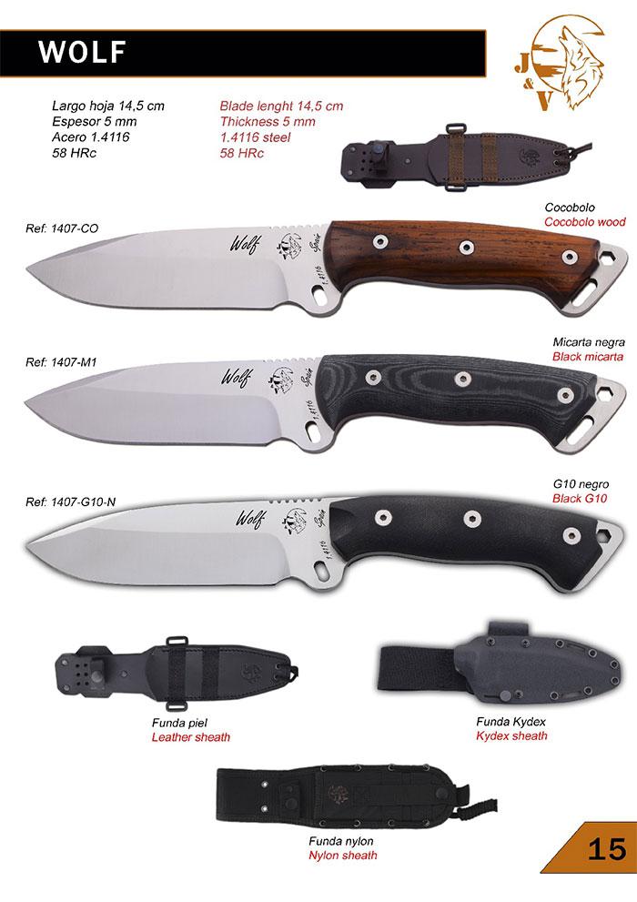 Cuchillo de caza Wolf con mangos de madera de cocobolo, micarta negra o G10 negro. Hoja de acero 1.4116, con una longitud de 14.5 cm. y un grosor de 5 mm. Con punta drop-point. Longitud total: 28 cm. Ancho de pala 3.5 cm.
