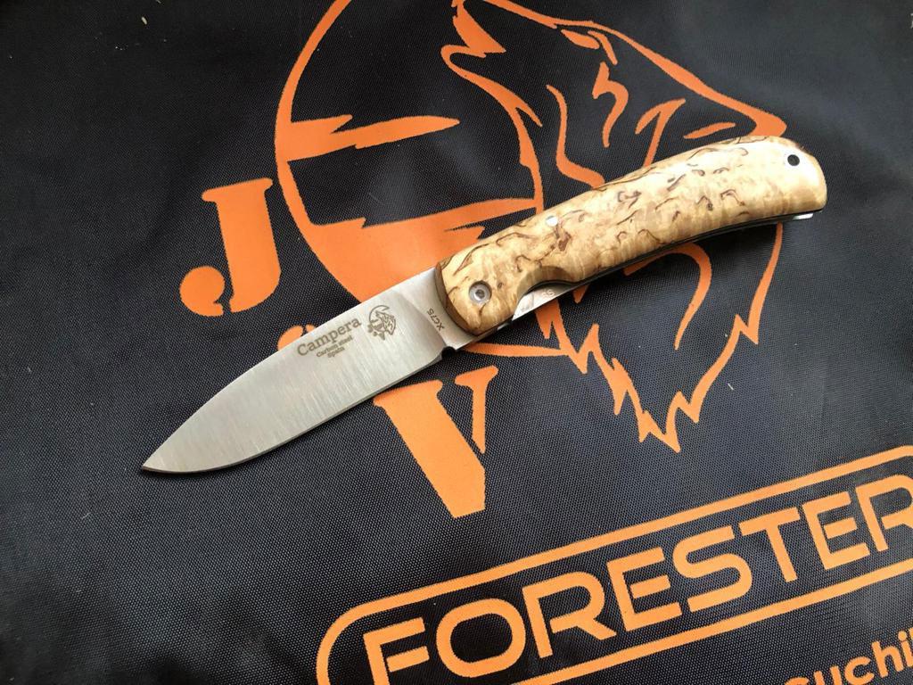 JV pocket knife with curly birch handle. XC75 steel blade with linnerlock lock.