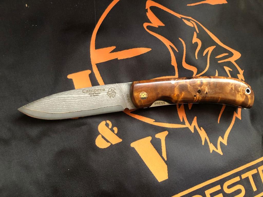 JV Campera Taschenmesser mit orangefarbenem stabilisiertem Holzgriff und Linnerlock. Ein moderner Klassiker mit einem ganz besonderen Griff.