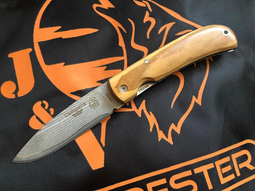 Navaja de bolsillo JV Campera con mango de madera de olivo y bloqueo linnerlock. Un clásico moderno con un puño muy especial.