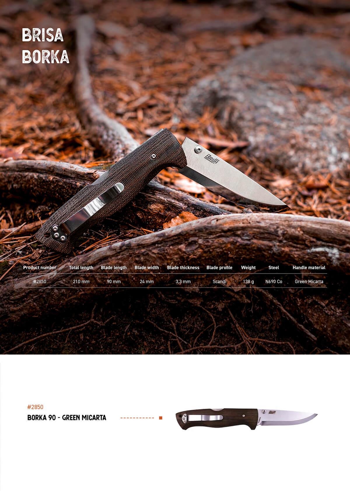 The Borka 90 fills a unique niche as a bushcraft folding knife. The heavy back lock mechanism, durable stainless frame and the large grip provide strength and safety. The green micarta handle gives a solid grip also in wet conditions.