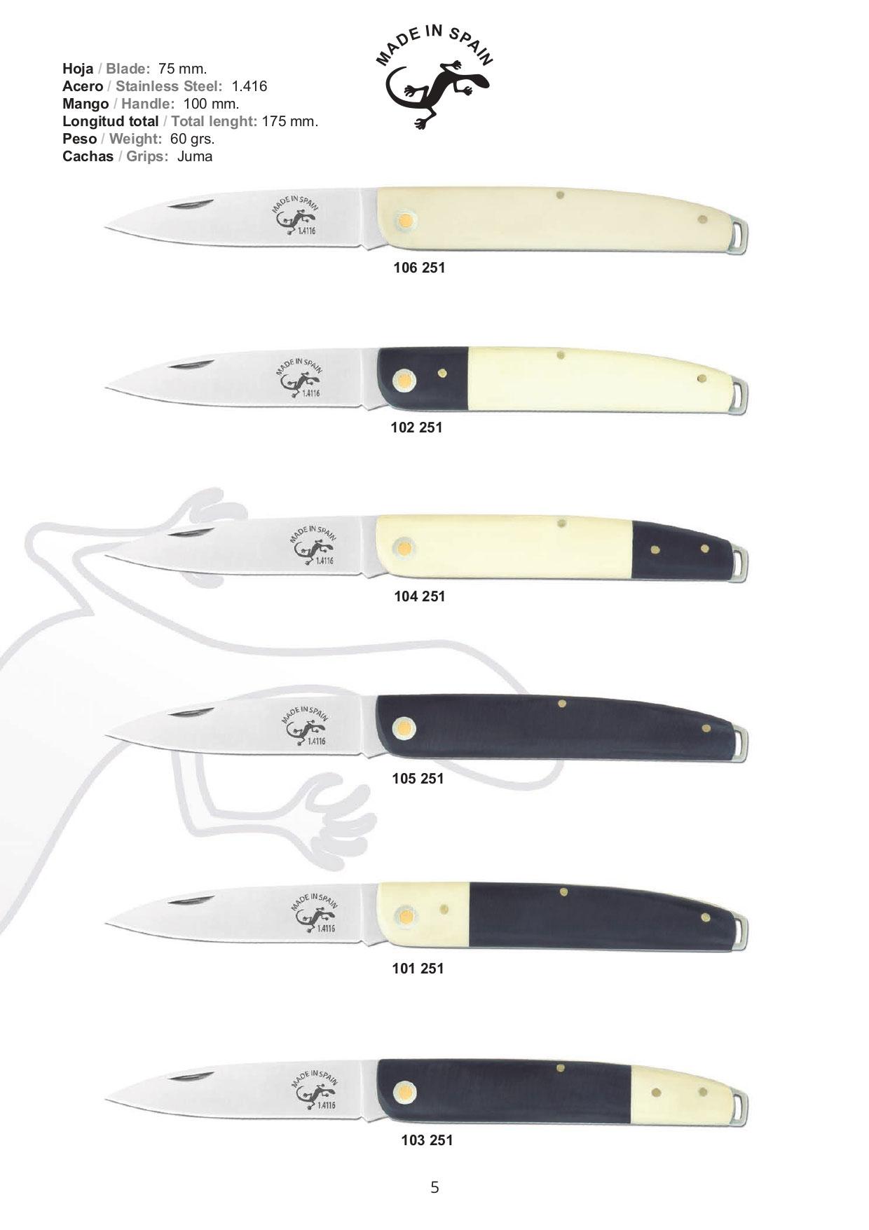 Pocket knives with a steel 1.4116 blade of 7.5 cm. Juma grips with different combinations. Handle length: 10mm, open length: 17.5cm. Weight: 60 gr.