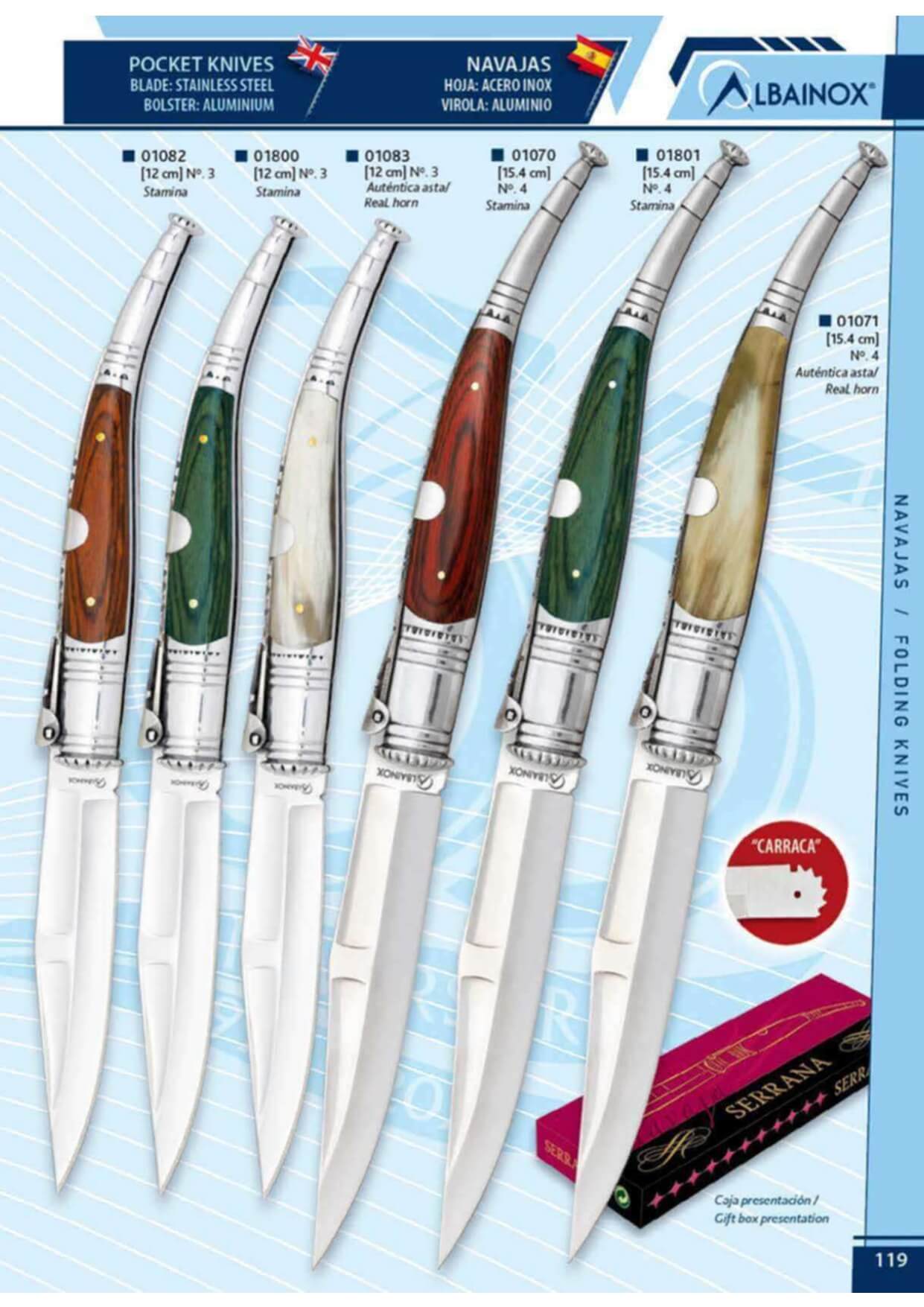 Coltelli Serranas a cricchetto con manico in stamina verde o rosso o in vero corno di toro. Per quanto riguarda le dimensioni, il coltello con la lama più piccola ha una lunghezza totale di 8,50 cm e quello con la lama più grande ha una lunghezza totale di 15,40 cm; tra questi due modelli ce n'è uno con una lama di 10,50 cm e un altro con una lama di 12 cm.