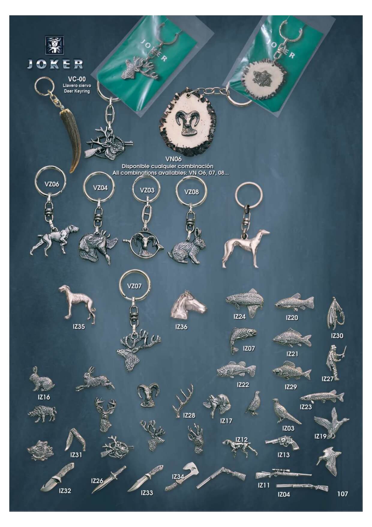 Chaveiros e pins com motivos de caça.