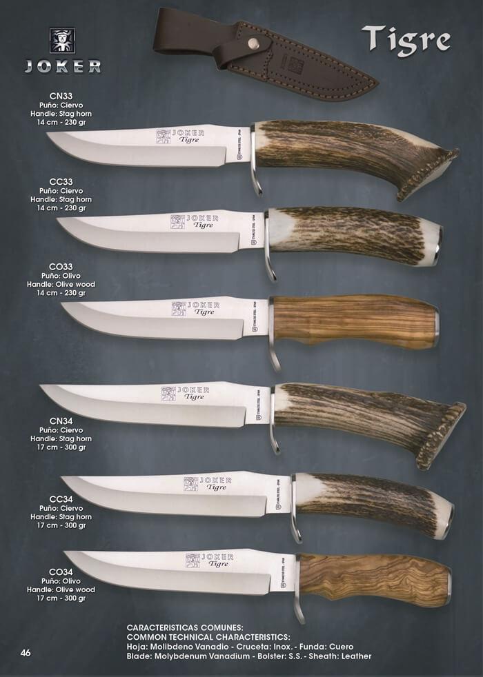 Lâminas de aço molibdênio vanádio de 14 e 17 cm. Cruz de aço inoxidável. Cabos de madeira de oliveira e chifre de veado.
