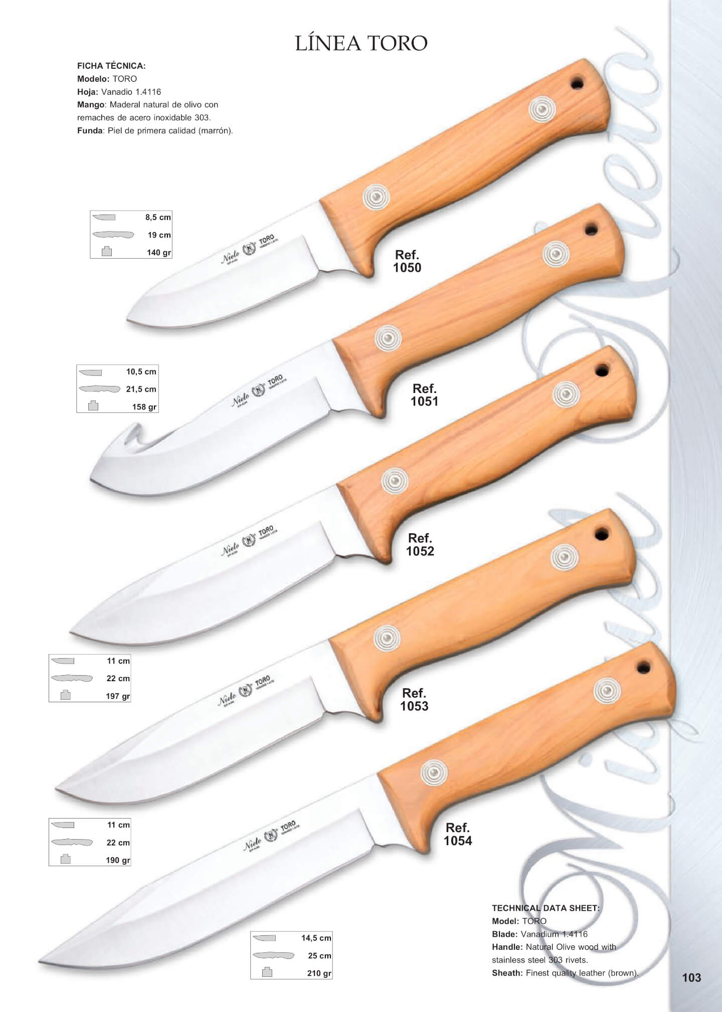 Lâmina de aço Vanadio 1.4116, cabo de madeira natural de aço inoxidável de ébano preto e rebites 330. Couro Premium (marrom).
