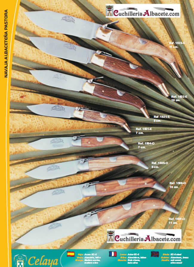 Canivete Albacete clássico com lâmina "pastora" de aço carbono ou aço inoxidável. Cabos de carvalho ou madeira de oliveira.