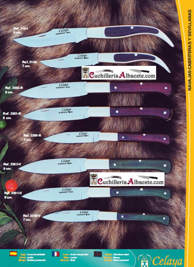 Canivetes clássicos Cabritera e Sevillana com lâmina em aço inoxidável. Cabos de madeira estampada. Ponteira de latão.