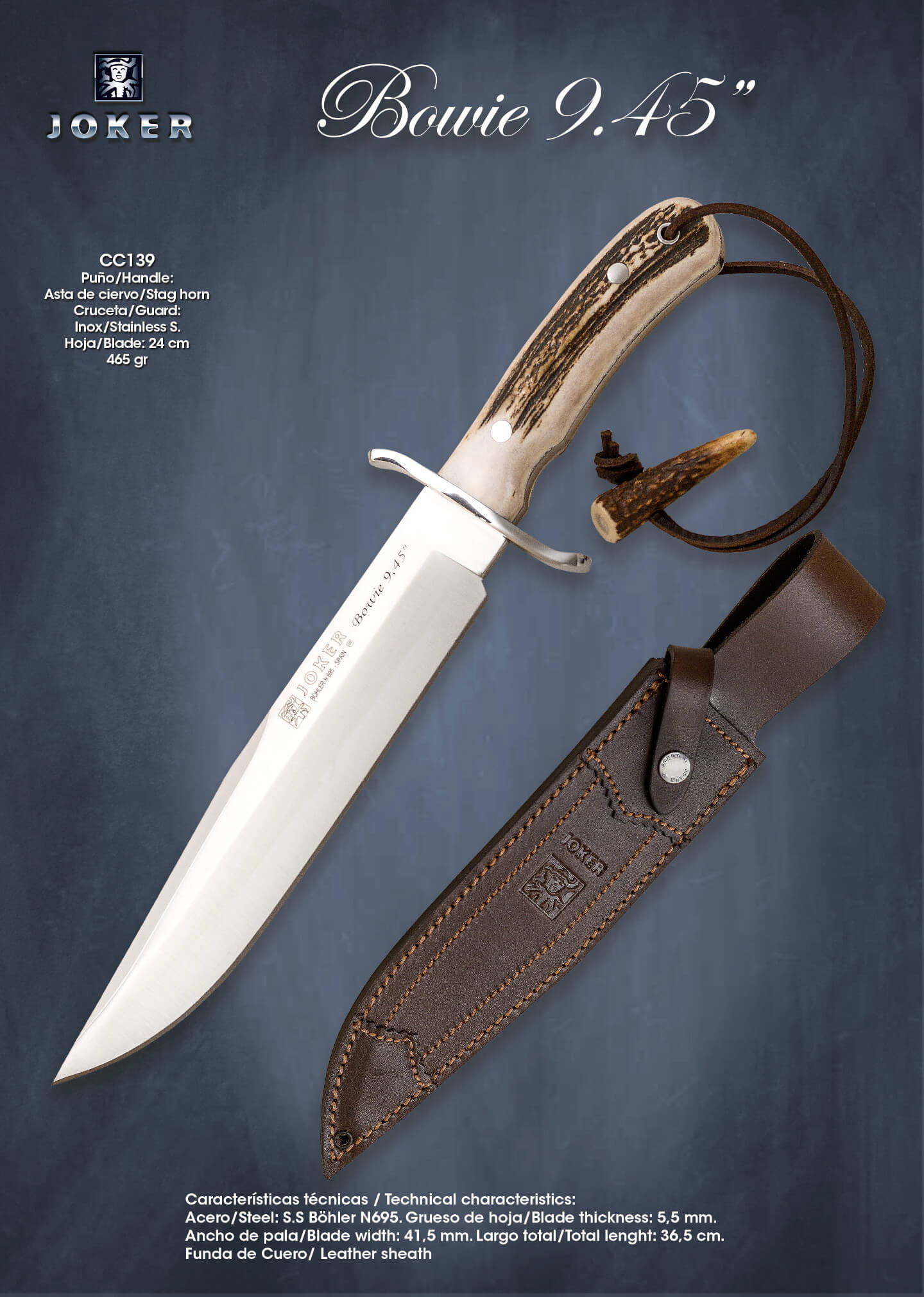 Faca de caça Joker Bowie 9.45 com cabo de chifre de veado
