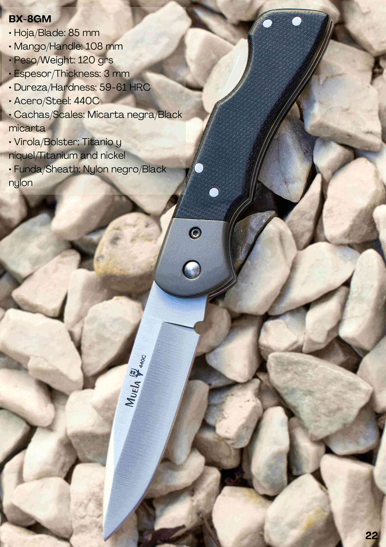 Canivete Muela BX-8GM.Um canivete leve com lâmina de aço inoxidável de 8 cm e fecho. O seu cabo em micarta preta é durável e elegante.Inclui bainha em nylon preta.