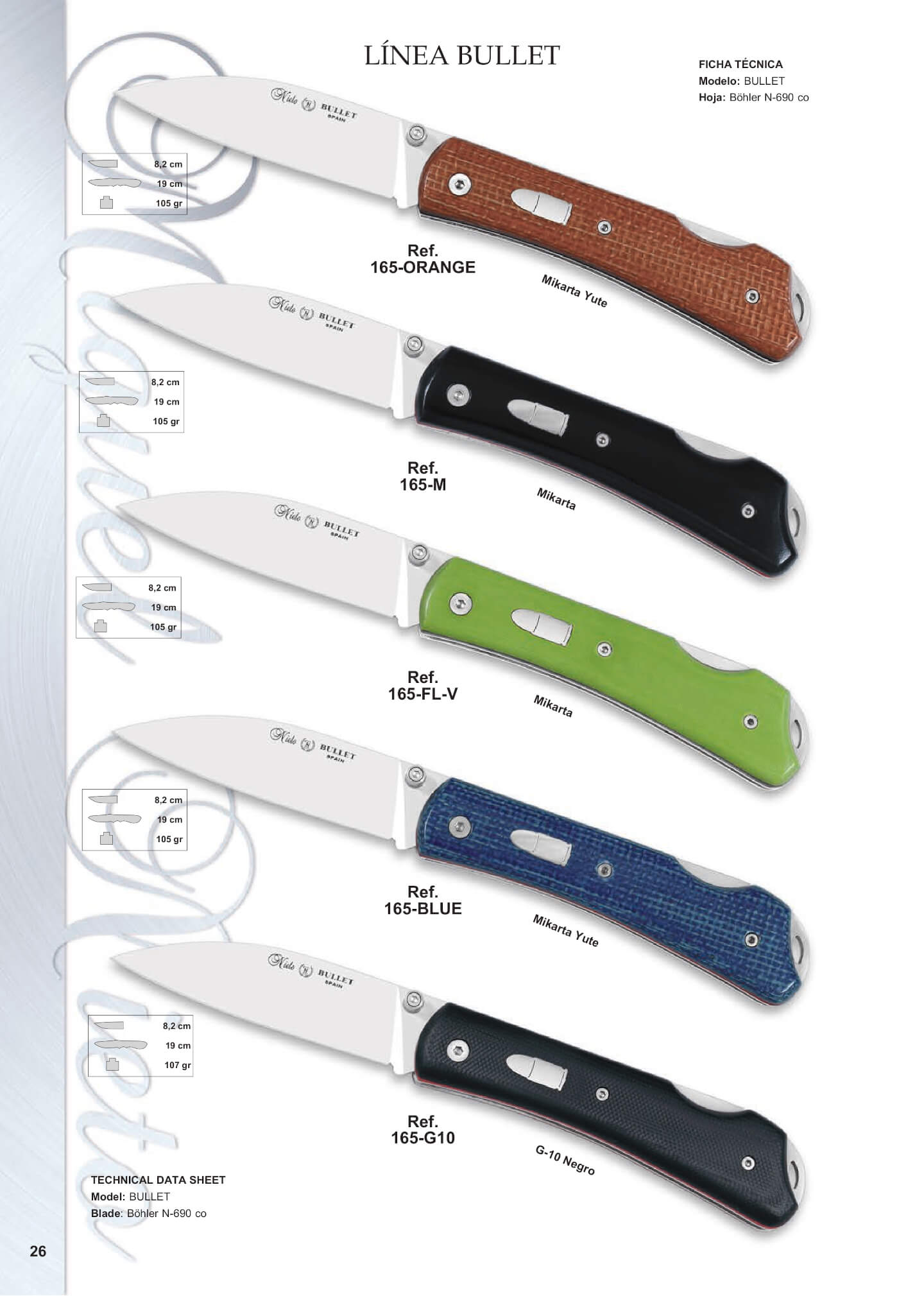 Canivetes da linha Nieto Bullet com lâmina de aço Böhler N690 Co de 8,2 cm. A lâmina possui uma saliência para facilitar a abertura com uma mão. Com trava de botão traseiro e furo para cordão. As alças têm uma bala embutida nelas.