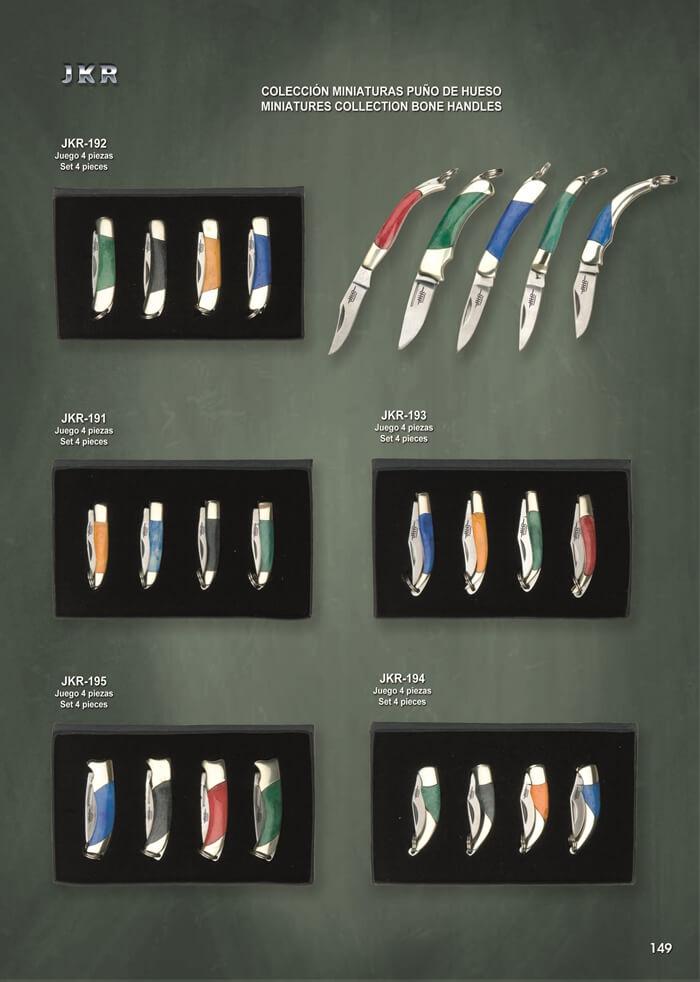 Conjunto de 4 facas clássicas em miniatura JKR com talas em latão...