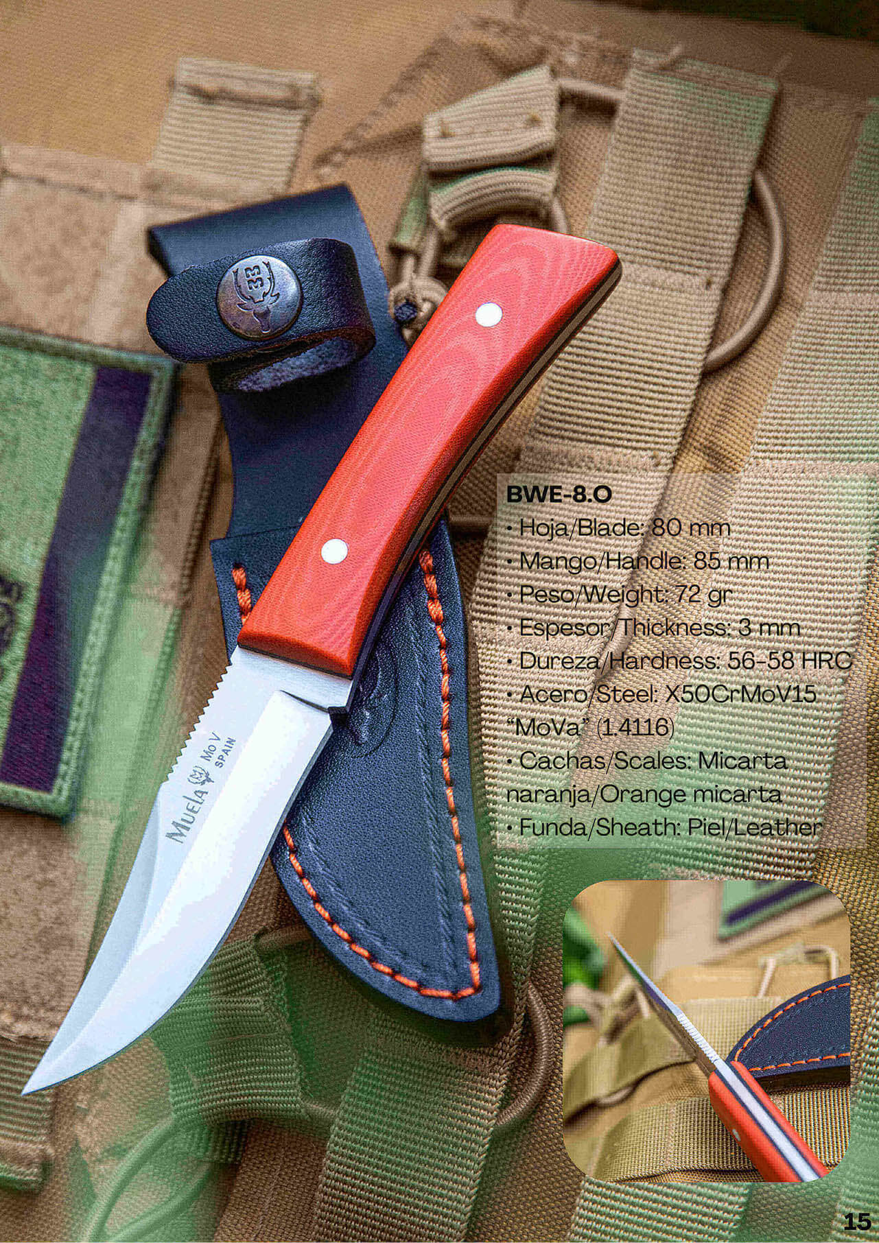 Uma faca de espiga completa com cabos de micarta laranja com divisórias pretas e uma lâmina de aço MoVa 1.4116 de 8 cm de espiga completa. Inclui estojo em pele preta.