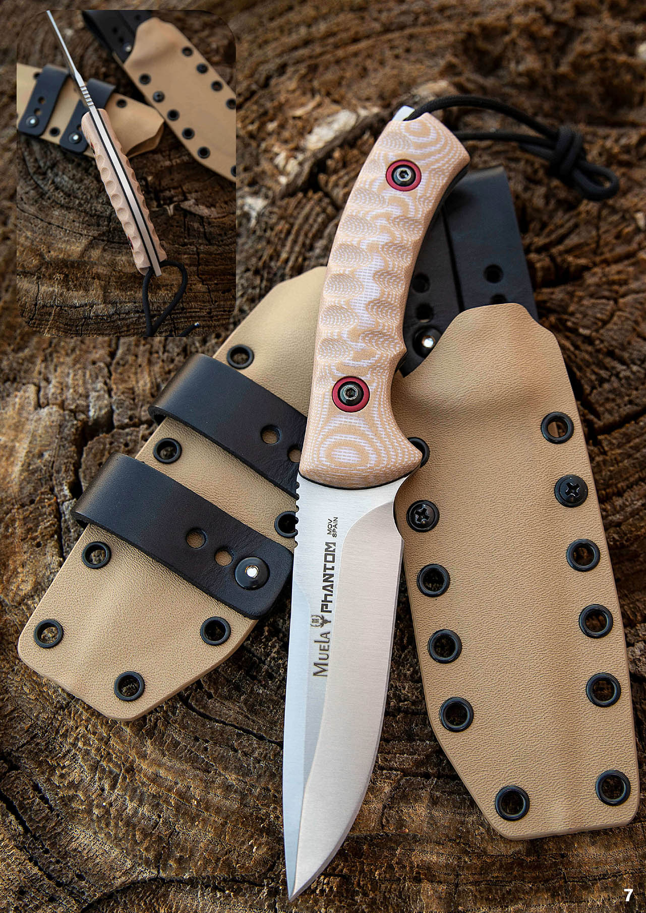 Faca de sobrevivência Muela Phantom. Uma faca resistente, robusta e potente, com cabos de micarta na cor do deserto e uma lâmina sólida de aço inoxidável MoVa com 12 cm de comprimento. Com bainha kydex multiposições na cor areia.