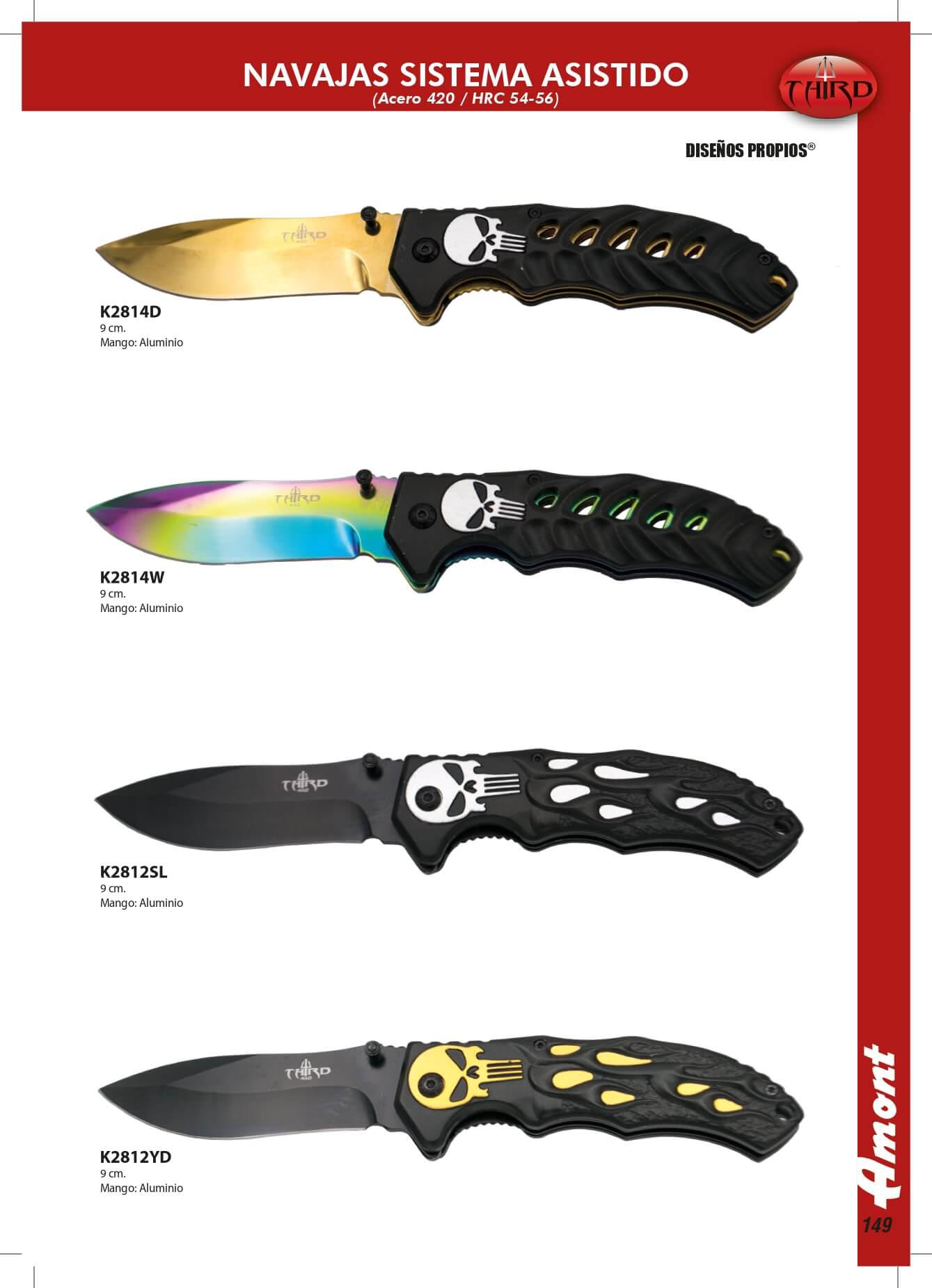 Facas com sistema de abertura assistida. K2814D Folha de 9 cm Punho: alumínio K2814W Folha: 9 cm Punho: alumínio K2812SL Folha: 9 cm Punho: alumínio K2812YD Folha: 9 cm Punho: alumínio