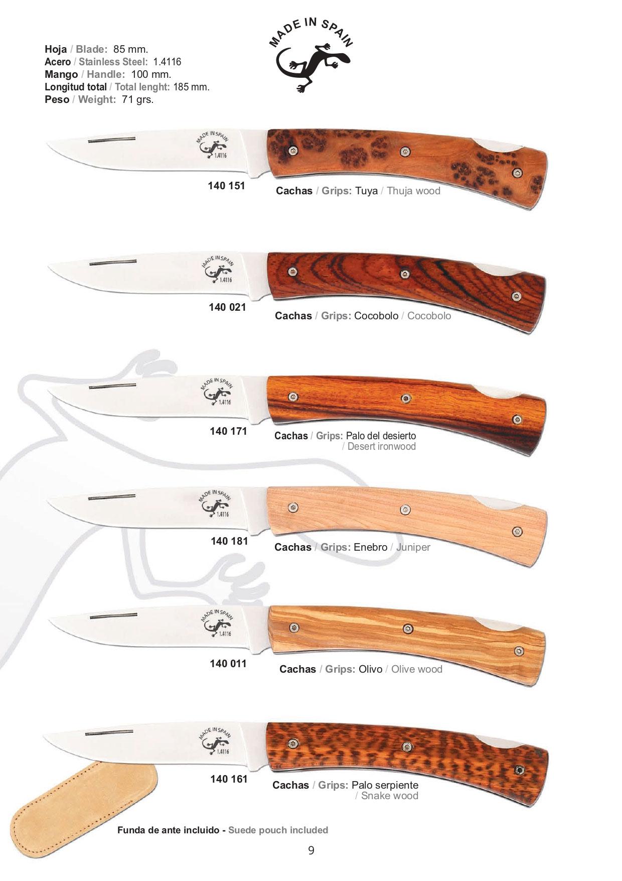 Facas da cutelaria Albacete Salamandra. Com lâmina de aço 1,4116 de 8,5 cm. Cabo de 10 cm, comprimento aberto 18,5 cm e peso de 71 g. Bloqueio do botão traseiro. Inclui capa de camurça.