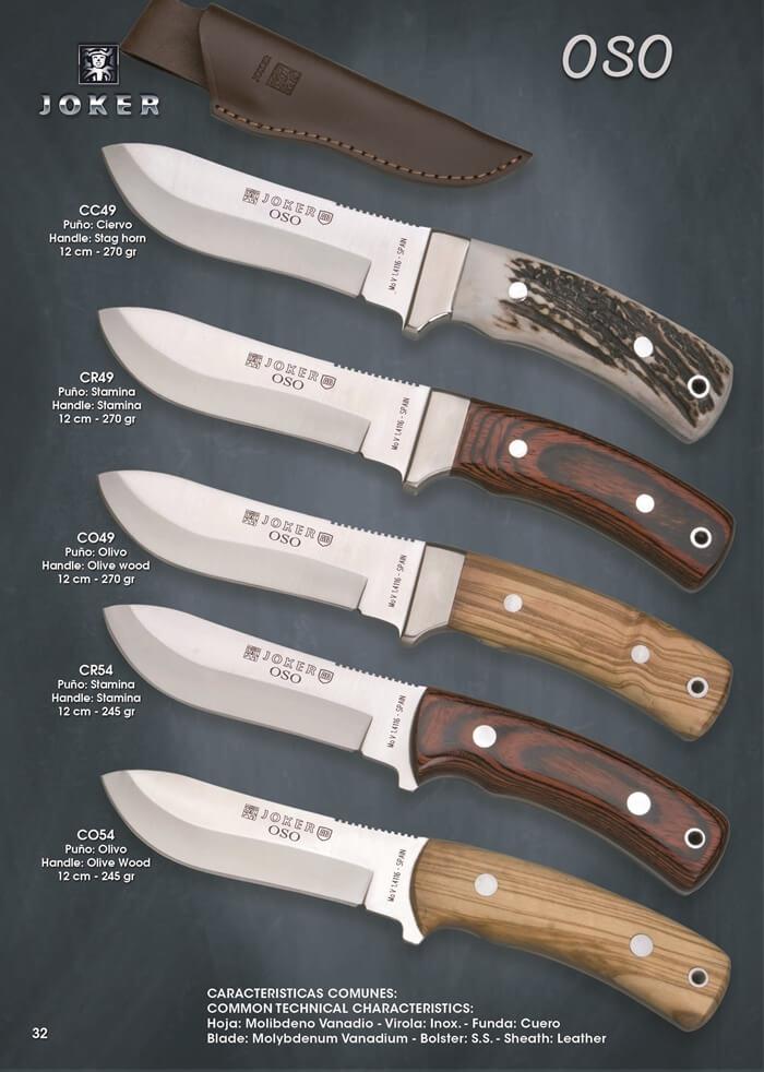 Facas de caça Joker Oso com lâmina de aço Molibdênio Vanádio de 12 cm. Ferrolho de aço inoxidável. Estojo de couro.