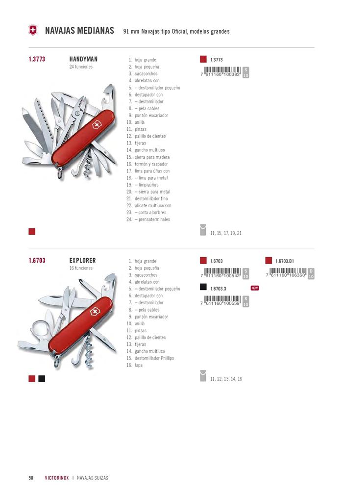 lâmina grande, lâmina pequena, abridor de lata, chave de fenda de 3 mm, abridor de garrafa, chave de fenda de 6 mm, stripper, alargador, saca-rolhas, tesoura, lupa, chave Phillips 1/2, gancho multiuso, palito, pinça, anel.