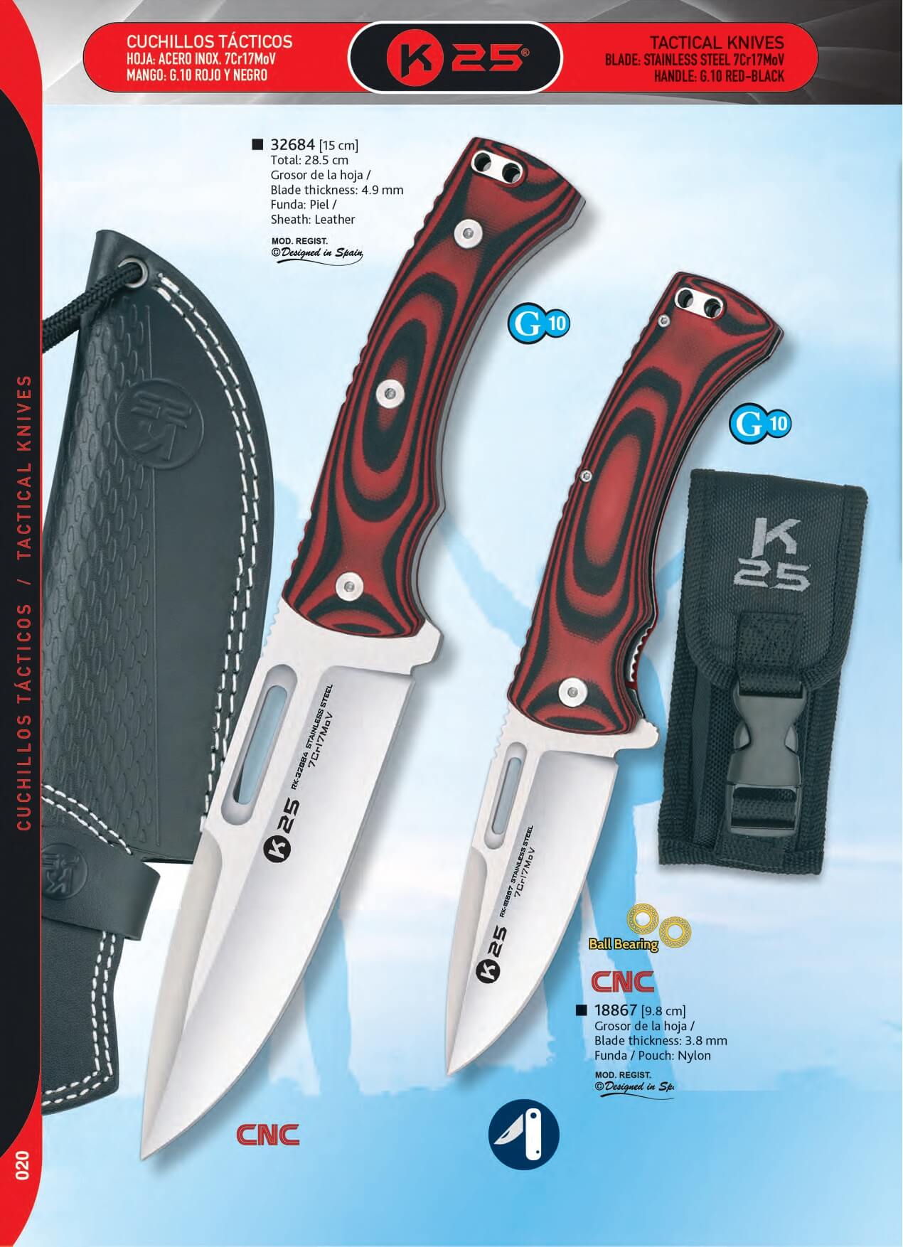Faca tática K25 com lâmina de 9,8 cm e cabo G10 vermelho e preto