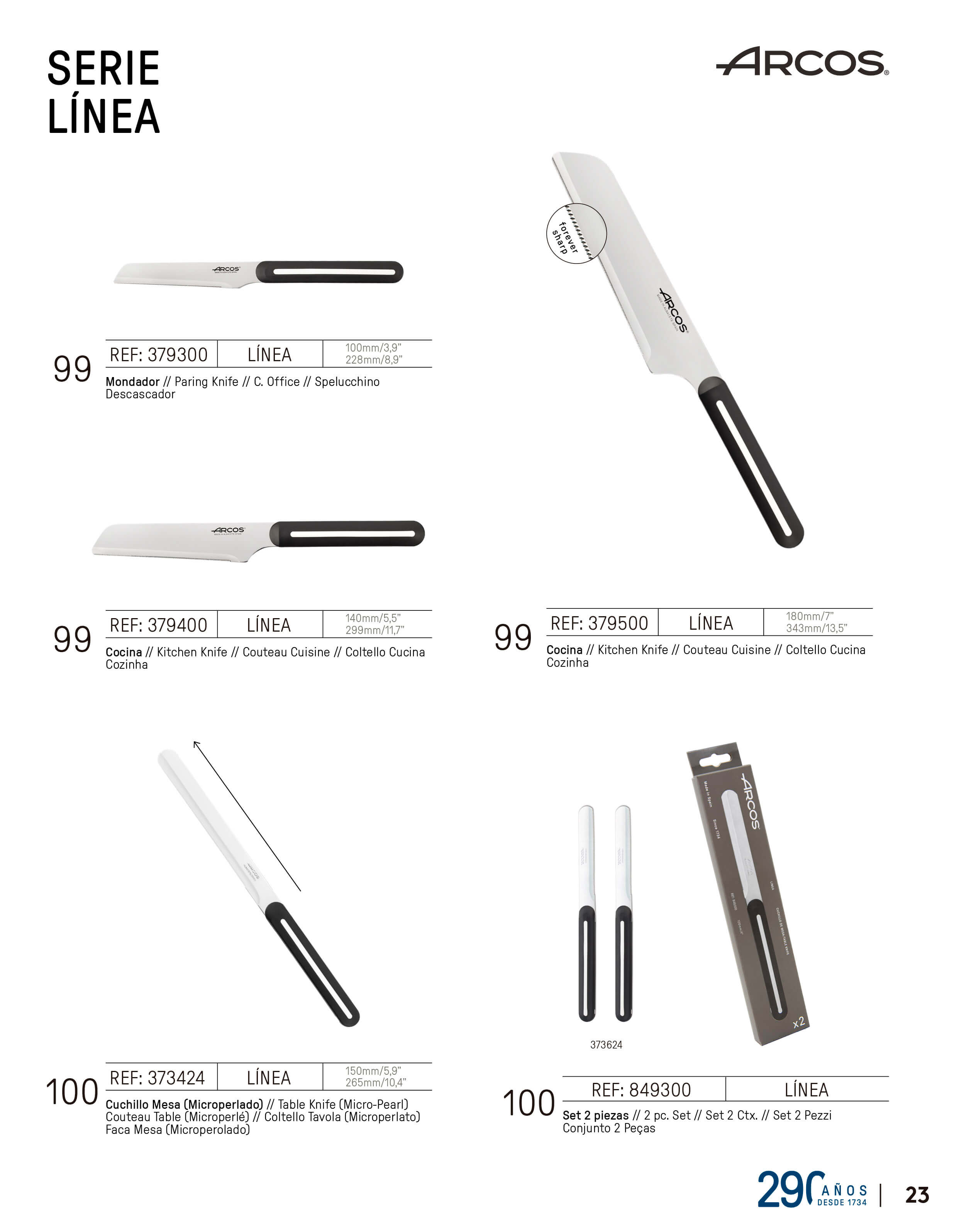 Coleção de facas de cozinha da série Linha Arcos. Uma gama de quatro modelos diferentes de facas Linea, de 228 mm a 343 mm de comprimento. Além de ter um conjunto de duas peças.