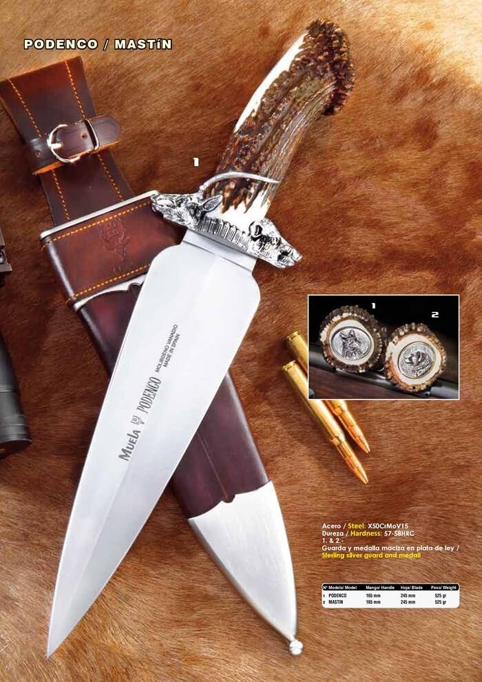 Facas leilão, Podenco e Mastiffs são uma reedição de duas das facas mais clássicos, marca Muela, que se tornou o líder indiscutível neste sector. Estas duas facas são feitas de aço X50CrMoV15 são distinguidos por libra moeda de prata sólida incorporado na roseta.