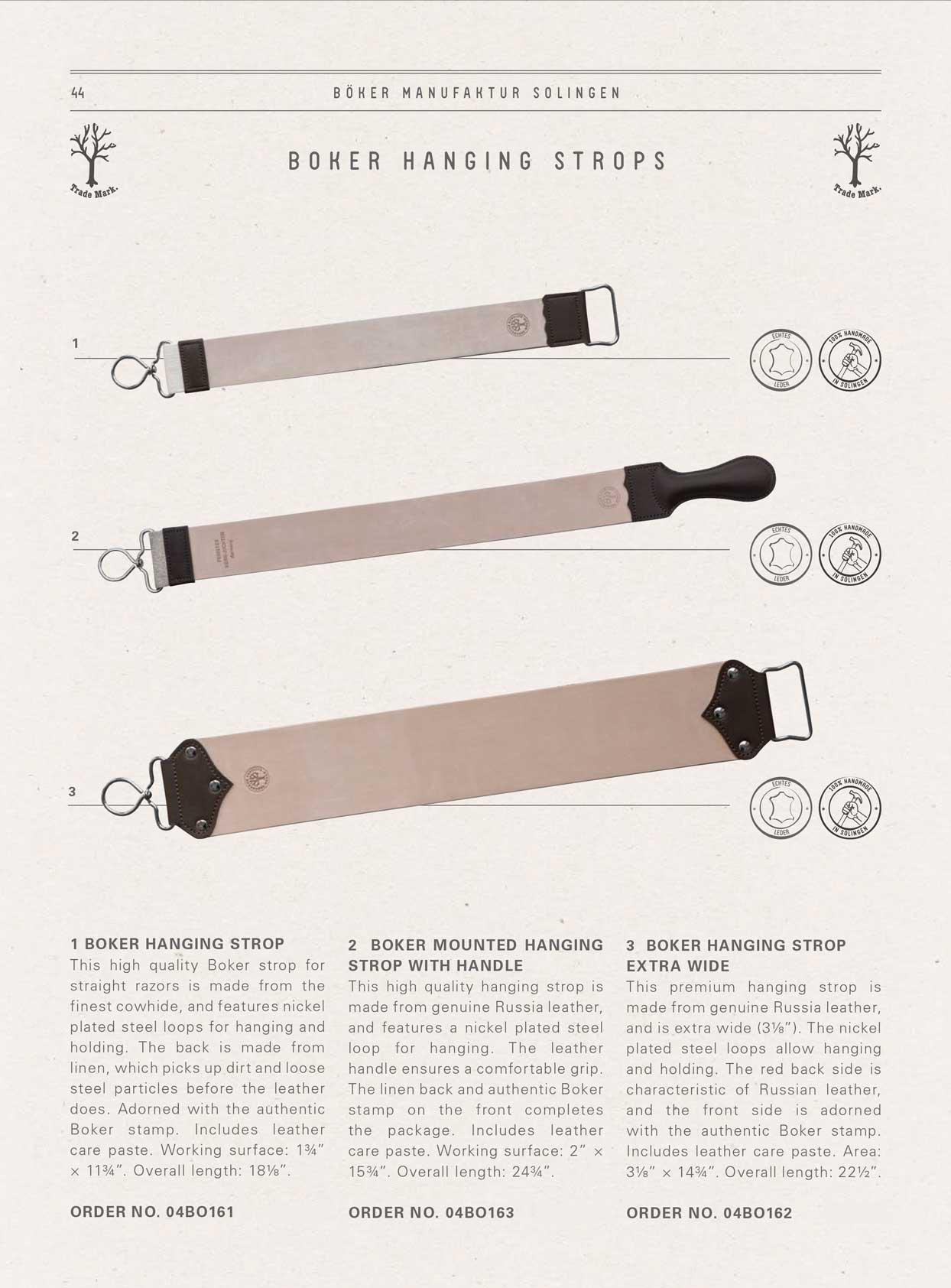 Correias Boker para barbeadores, feitas com o melhor couro e com ilhós de aço niquelado para pendurar e segurar. O linho absorve a sujeira e as partículas de aço soltas do couro. Incluindo a gravação autêntica do Boker. Entrega incluindo pasta de couro. Área de trabalho: 4,5 x 30 cm. Comprimento total: 46 cm.