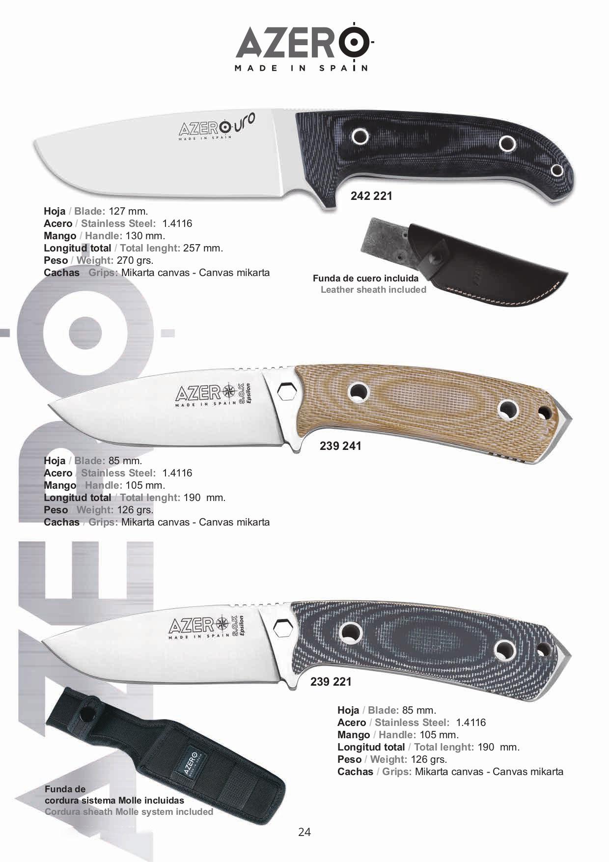 Azero Epsilon 239221 y 239241. Faca de sobrevivência é uma faca de aço ACX-380 com cabo Mikarta lona. Inclui bainha de Cordura com sistema MOLLE.