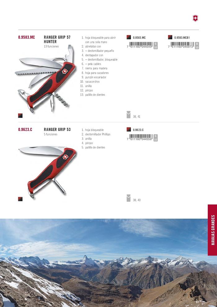 - 0.9583.MC RANGER GRIP 57 HUNTER: Faca multiuso com 13 funções. Bloco de lâminas para abrir com uma mão, abridor de latas com chave de fenda pequena, removedor com chave de fenda com chave, descascador de fios, serra de madeira, lâmina para caçadores, furadeira, saca-rolhas, anel, pinça e palito de dentes.