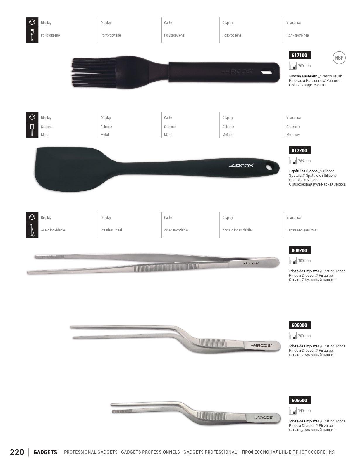 Utensilios de cocina. Brocha pastelera de polipropileno. Espátula de silicona con interior metálico. Pinzas de emplatar de acero inoxidable.
