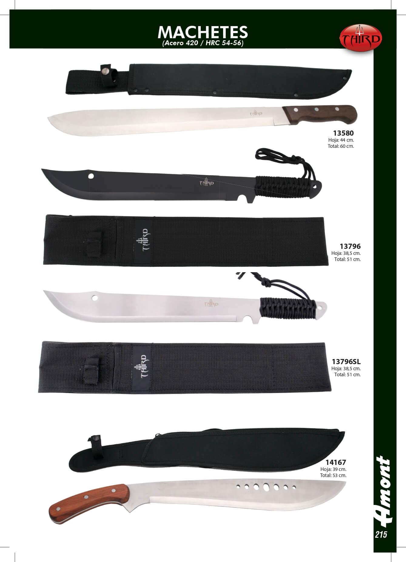 13580 Machete cortacañas con hoja de 44 cm (42,5 cm de corte). Grosor de la hoja 3.75 mm. Longitud total: 60 cm. Mango de madera. Peso del machete: 650 gr. Incluye funda de nylon.