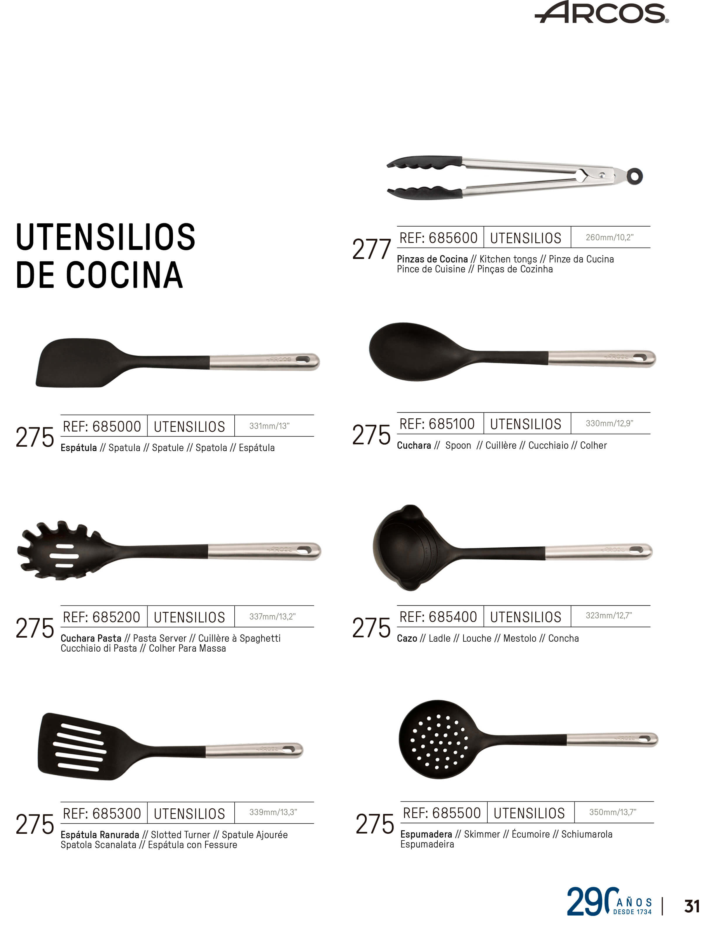 Cuenta con unas pinzas de cocina, una espatula, una cuchara, una cuchara para la pasta, un cazo, una estapula ranurada y una espumadera. Todos ellos compuestos de aceros inox y silicona.