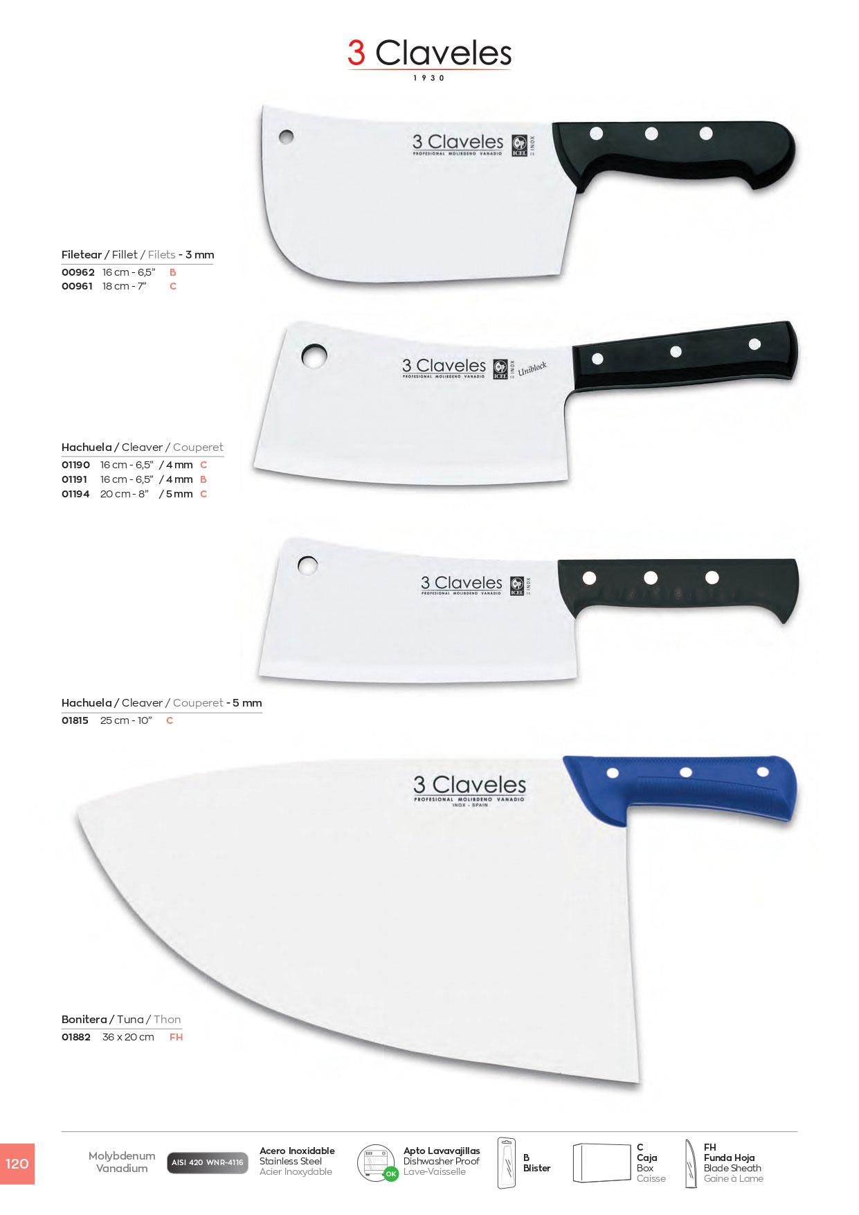 Cuchilleria profesional, Hachuelas, Aplastador, Media luna, Acero Inoxidable.