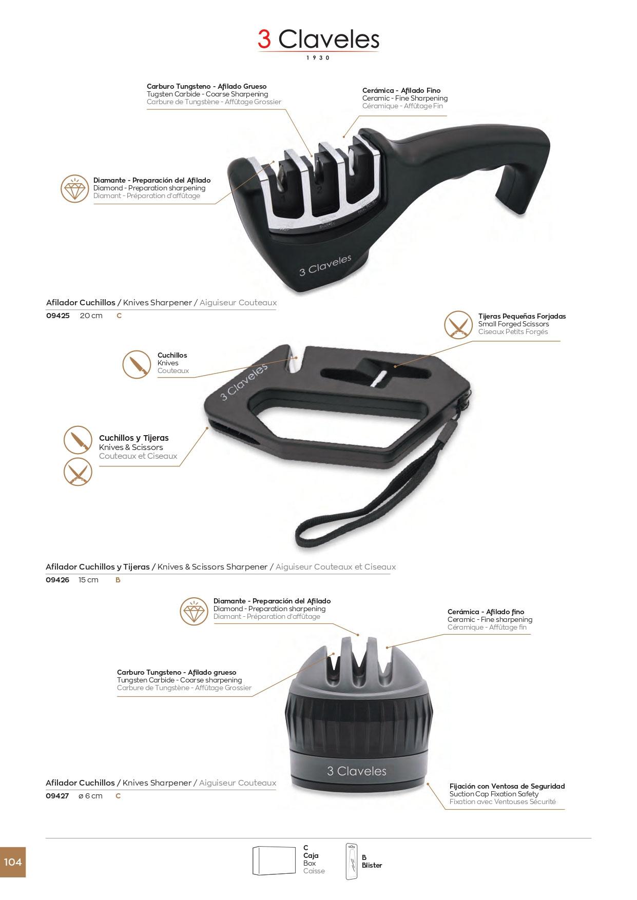 9425 Afilador de cuchillos: ranura de diamante para preparar el afilado, ranura de carburo de tungsteno para un afilado grueso, ranura de cerámica para un afilado fino.