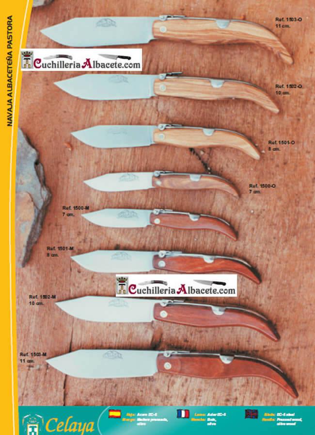 Navaja clásica albaceteña con hoja "pastora" de acero de carbono o acero inoxidable. Mangos en madera de olivo o madera roja.