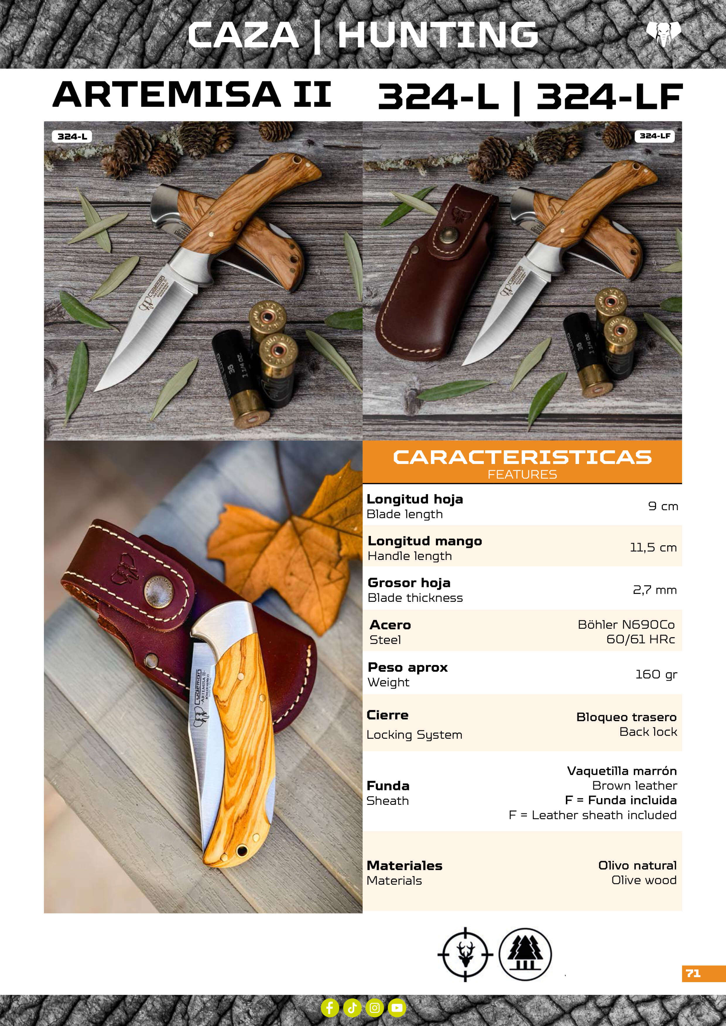 Navaja de caza con virola fabricada en acero MOVA resistente al desgaste con sistema de cierre bloqueo trasero y punta de la hoja clip-point. Hoja de 9.50cm y mango de olivo satinado.