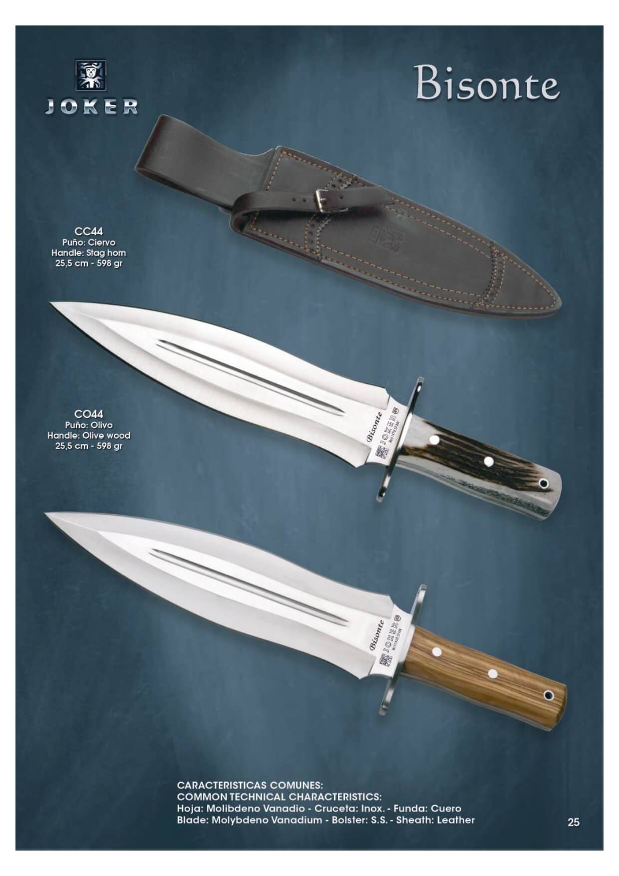 Cuchillos Joker. Serie Bisonte. Hoja de acero Molibdeno Vanadio. Cruceta inox. Funda de cuero. Longitud de hoja: 25.5 cm. Peso: 598 gr. CC44 Ciervo CO44 Olivo