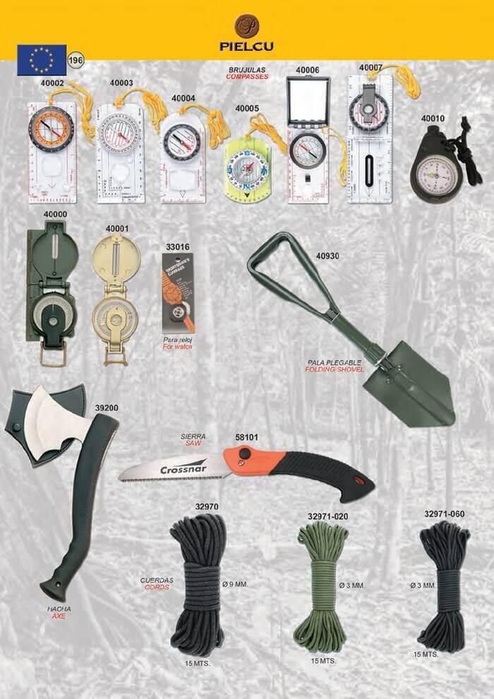 Distintos tipos de brújulas, incluidas brújulas para reloj, o brújulas con kit de supervivencia. También hay artículos como por ejemplo un multiusos con escamador, lima, abrelatas, desanzuelador, abrebotellas, tijeras, punzón, sacacorchos, destornillador, sierra, y enhebrador; las herramientas perfectas para el camping o para una jornada de supervivencia.