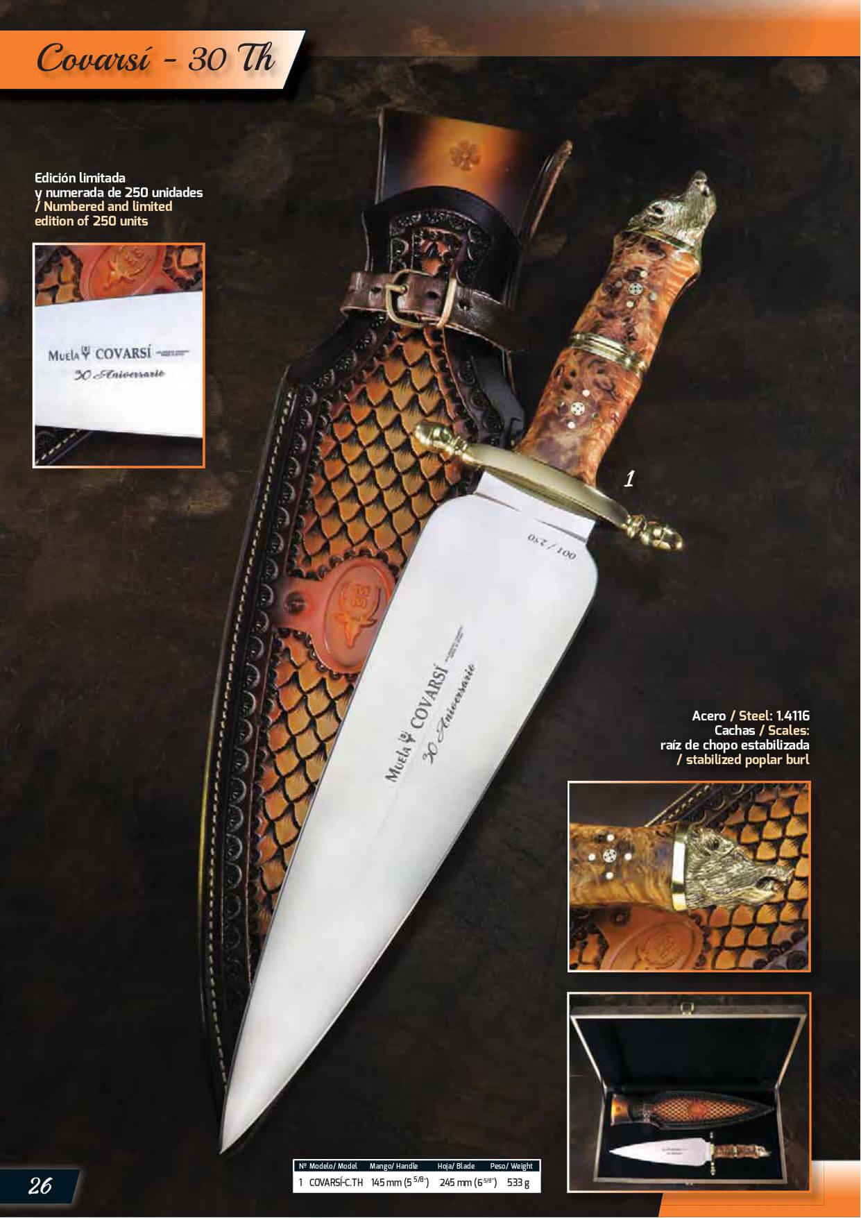 El cuchillo Covarsi es uno de los cuchillos más conocidos de Muela, creados en homenaje a D. Antonio Covarsí y por eso en su 30 aniversario han querido hacerle un homenaje con este nuevo cuchillo de lujo de edición limitada: Covarsi-C.TH. Una pieza de colección, a la vez que perfectamente creada y dispuesta para servir como cuchillo de remate en el lance definitivo de la caza en Montería. Limitado a 250 unidades.
