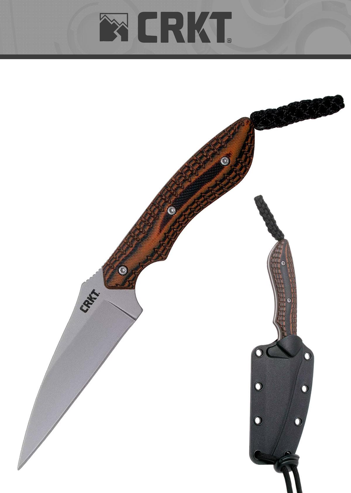 Cuchillo enterizo con una longitud total 15.9 cm. Hoja Wharncliffe de acero inoxidable 5Cr15MoV con acabado granallado de 7.66 cm. Mango G10 negro y marrón. Cordón negro para el cuello. Empaquetado con clip que se puede unir a la funda para llevar en el bolsillo. Funda de cuello negra.